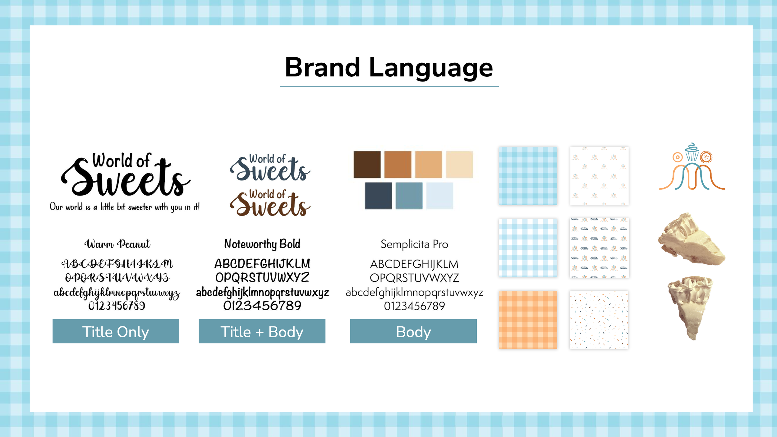 World of Sweets’ brand identity utilizes a palette of warm and cool pastels paired with friendly, nostalgic typefaces. The logo for the event showcases figures with “dessert heads” to symbolize connection between strangers with diverse tastes. Custom patterns and original sepia-filtered photography were also incorporated into this brand.